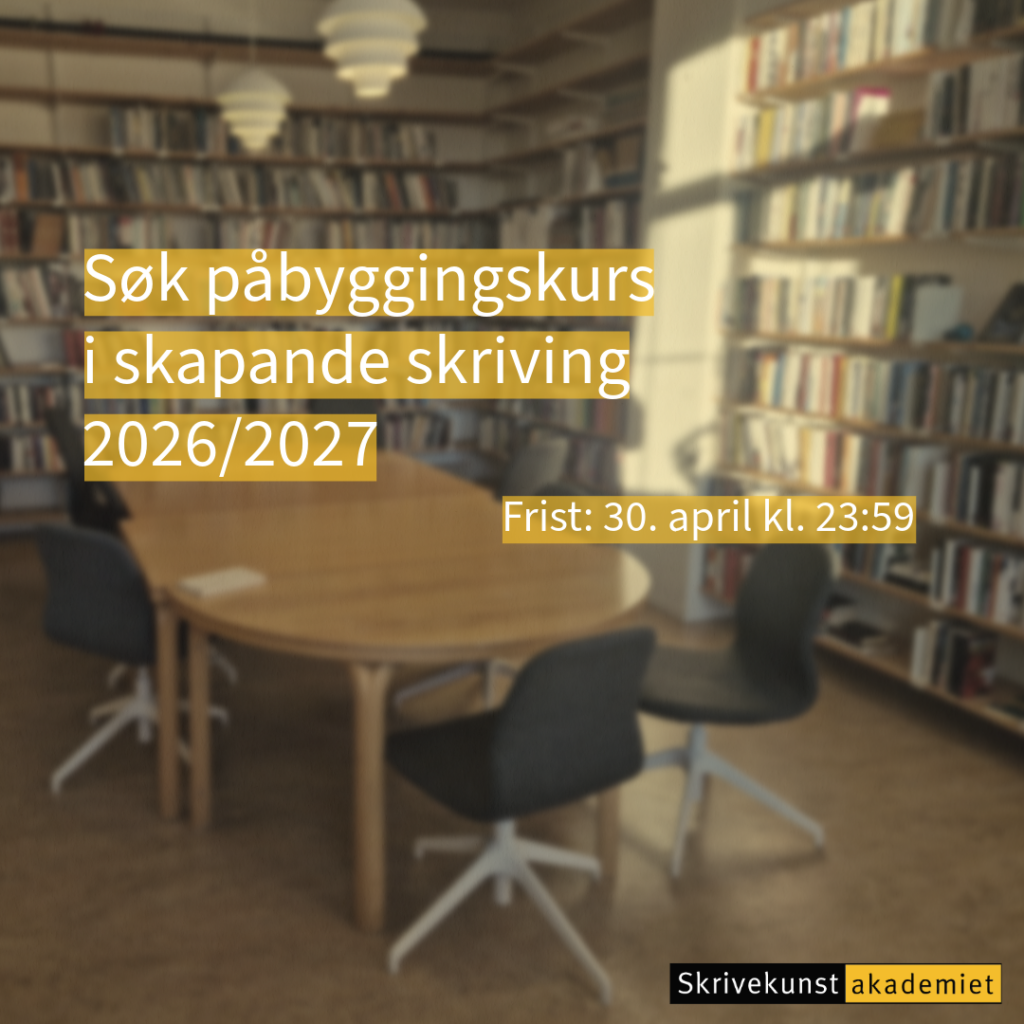 Men dette vil òg sei at vi er på leit etter ein ny leiar for Skrivekunstakademiet. Stillingsutlysinga litt ute på finn.no. Er det deg vi ser etter? Eller kjenner du nokon som er ein god kandidat? Søknadsfrist 15.02.26.